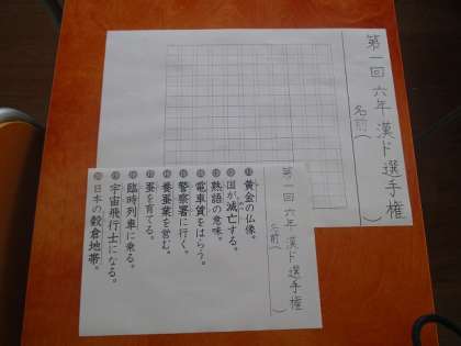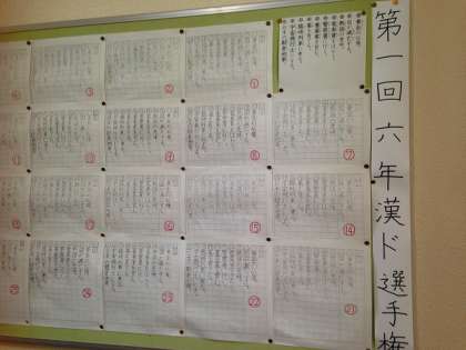 6年生では昨年度に引き続き「漢ド選手権」を行っています。漢字ドリルとまったく同じ字で例文を書いて,子どもたちの投票で順位を決める取り組みです。6年生になってから「今年の漢ド選手権はまだですか?」と聞いてくる子がいるように,子どもたちも楽しみにしています。漢ド選手権本番では皆とても集中して書き,中には1時間では納得できる字にならず休み時間も使って仕上げる子もいます。この漢ド選手権をしてから見本通りの字を書こうと意識する子が増えています。