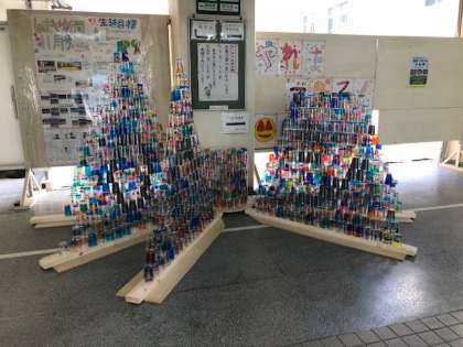 昨日はピロティの壁際に待機していましたが、お祝いの集会も終え、今朝からは、子どもたちを迎える玄関に設置されています。