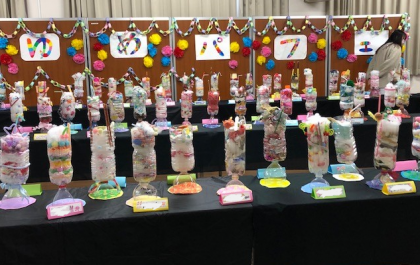 校舎に入って右の多目的室は、1年生の作品の展示です。「ゆめパフェ」と題された立体工作の作品たちは、おいしそうな夢のパフェです。子どもたちの夢がいっぱい詰まったパフェを綿や毛糸、紙粘土で作りました。大きなペットボトルのグラスに入った、食べきれないくらいの夢を、子どもたちは表現しました。