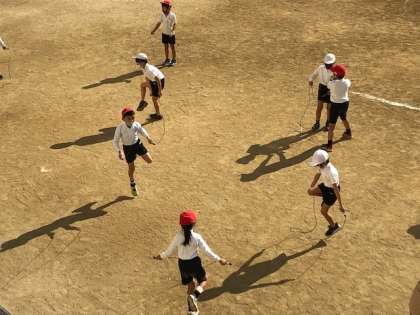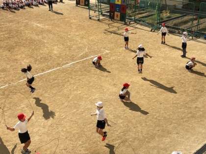 2年1組がみんなでなわとびをしています。