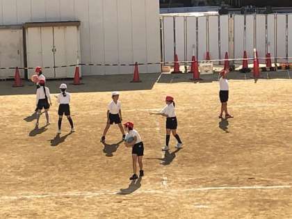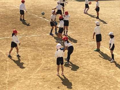 2年2組の2時間目。運動場で、ボールを使っての活動です。