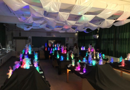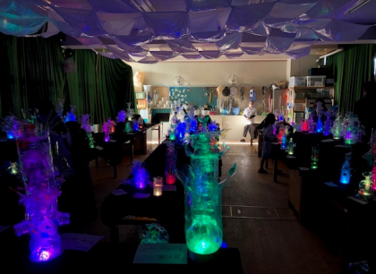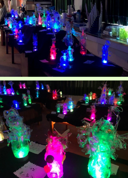 展示の理科室では部屋を暗くし、作品の一つずつに内側から色とりどりに光るライトをあてています。ペットボトルを切り開いて、熱で変形させ、自分の思うように形を作っていきました。
