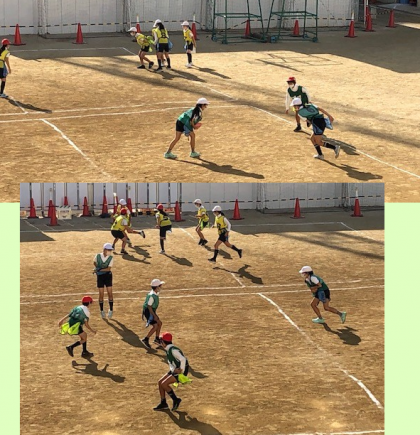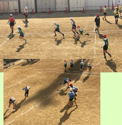 腰にカラーの布をつけて、攻守分かれて競い合うタグラグビーのようです。