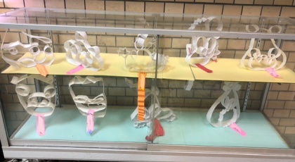 玄関のケースの中も2年生の作品です。