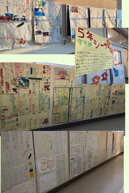 シーサーと壁新聞。沖縄一式になった展示会場の図工室は、沖縄のムード満点の音楽も流され、観るものの気分を盛り上げます。