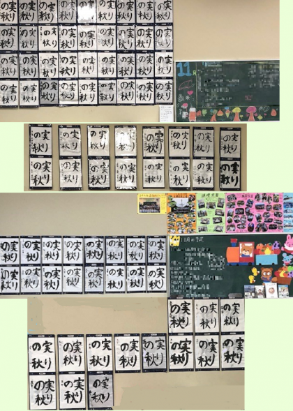 会場と離れた教室の後ろの壁には、「実りの秋」と書いた習字の展示があります。