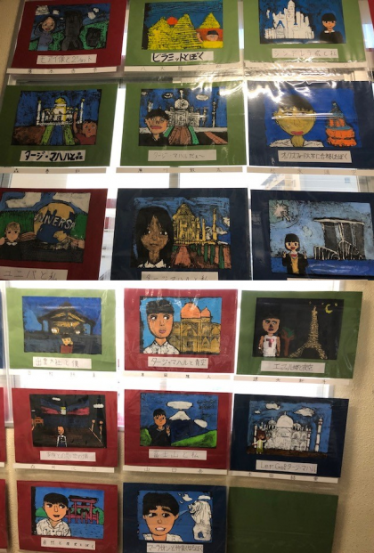 自分の顔、そしてその背景には、行ってみたい場所や歴史で登場した場所を彫り、そこに旅している自分をえがいた版画です。