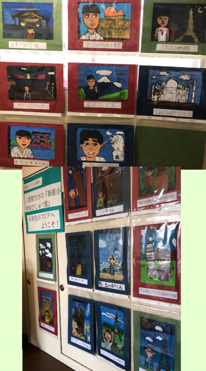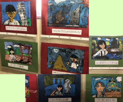 教室を見ると、どのクラスも、後ろの壁一面に作品が展示されています。