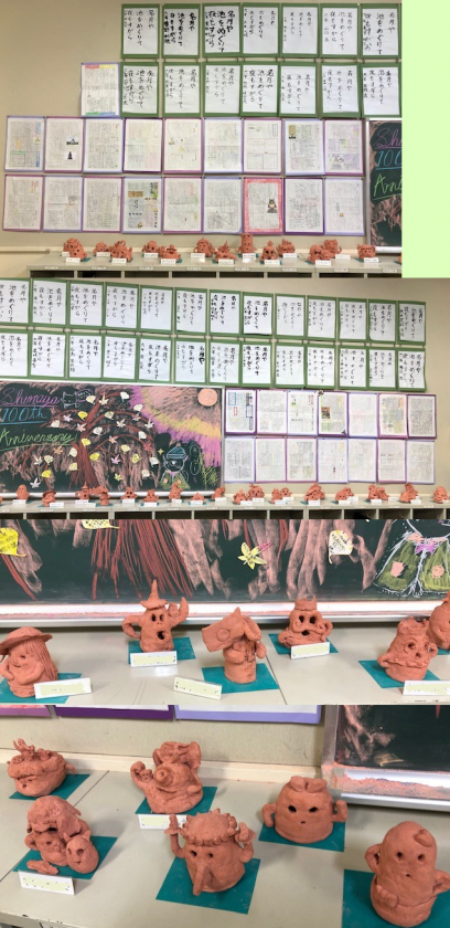 棚の上には、調べ学習をした後に取り組んだ、「埴輪」の粘土作品です。