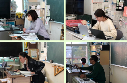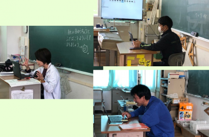 写真は、話しかける先生の様子と、パソコン画面の中の子どもたちの様子です。