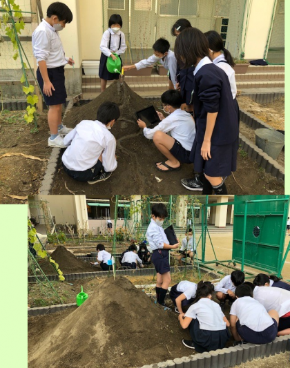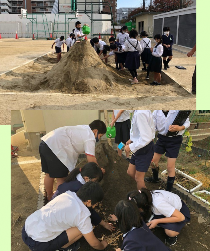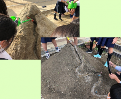 5時間目の学習のために、理科の先生が土を盛って作った山でした。5年4組の子どもたちは、その山で水の流れ方を学習しました。