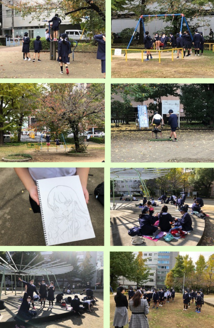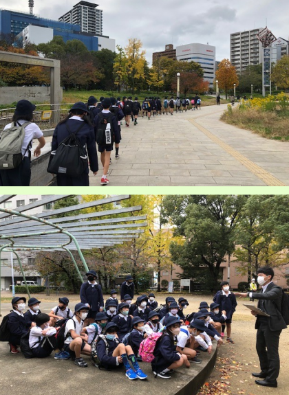 JR「天満」駅を降りて徒歩数分の所に目的地はありますが、時間が来るまで、子どもたちは社屋の隣の公園で、遊具に乗ったり絵を描いたりして時間を過ごし、お弁当を食べました。