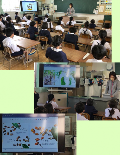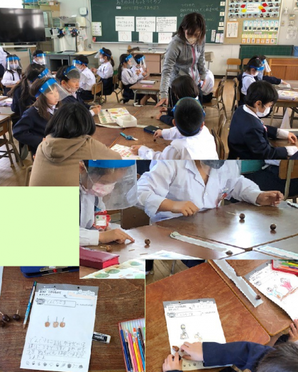 最後のまとめに子どもたちは、コマの絵を描いて、どんぐりの色や形、頑張ったことなどをプリントに書きました。