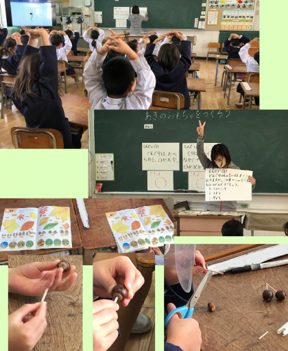 まず先生は、どんぐりの絵本を読み聞かせて、どんぐりについて興味を持たせました。絵本からどんぐりのクイズを3題出したあと、子どもたちに「どんぐりのコマを作りましょう」といったときには、もう、子どもたちから大歓声が上がりました。
