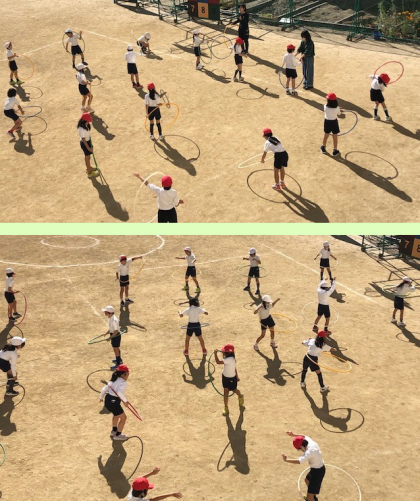 そのあとはクラスに分かれて、3年3組は、フラフープを用意しました。