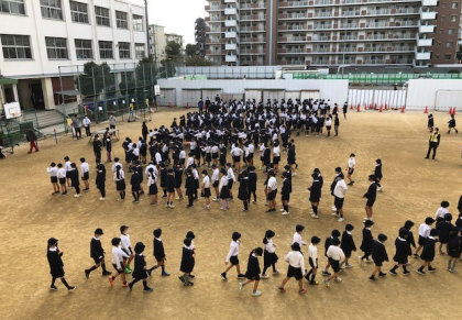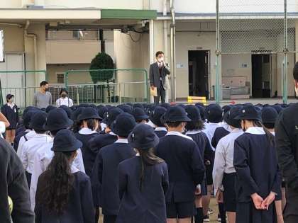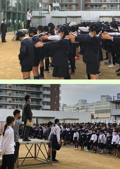 久しぶりの運動場での集会です。校長先生と朝のあいさつをしたあと、お話を聞きました。