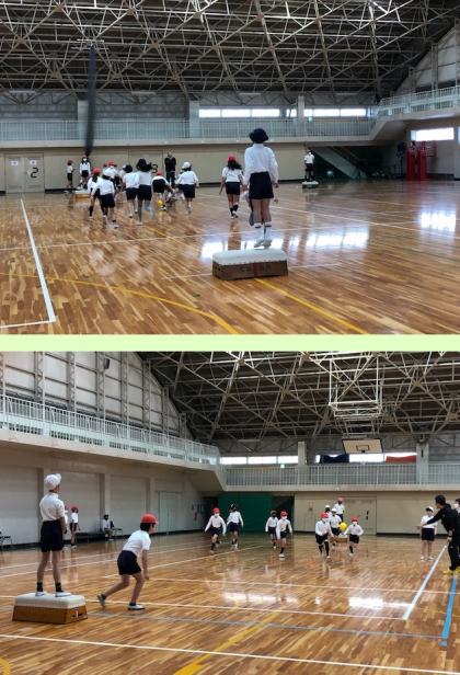 体育館の工事中、学校の隣の敷地に建つ会社の体育館をお借りして、体育の授業をしている本校。今日の2時間目は、4年3組と4組が道路を挟んで西にある体育館に出かけました。