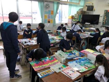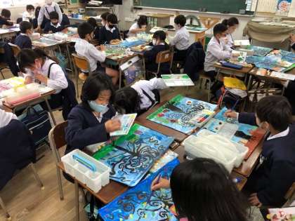 絵の具を、ジュースのように薄くしたり、マヨネーズのように濃くしたり、試しながら着色していく子どもたち。パスも使って仕上げていきます。
