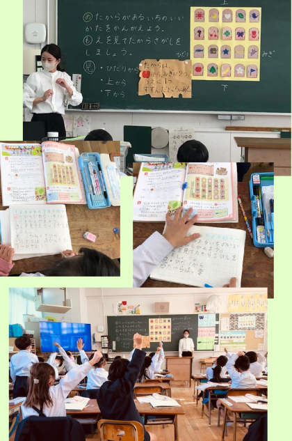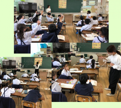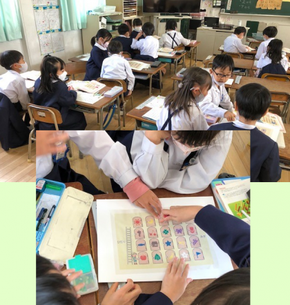 黒板に貼ってある絵の、ひだり、みぎ。そして、上、下。それを使って何番目か言うと…。楽しいゲームになってきます。基になるなるものを決めて言うとわかりやすいことも学習しました。