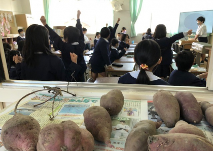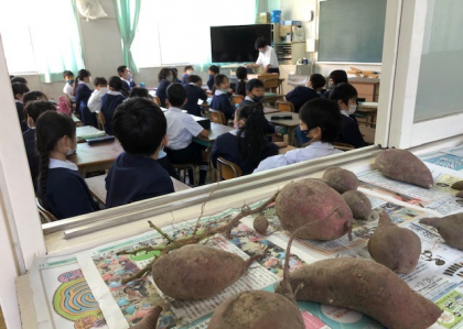 2年生の教室前の靴箱の上には、先日掘った大きなサツマイモが並べられています。