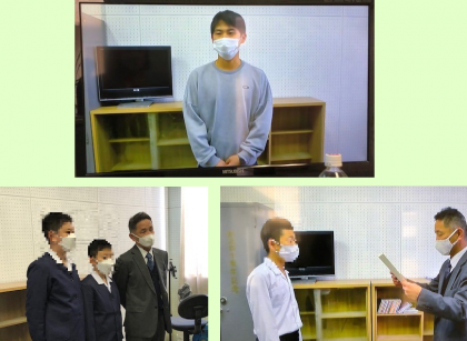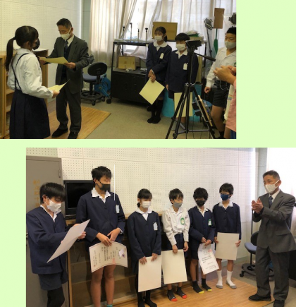 先に、校長先生から、中国からの転校生と、税の習字の作品で表彰された人たち、陸上競技大会でよい成績を収めた人たちの紹介がありました。