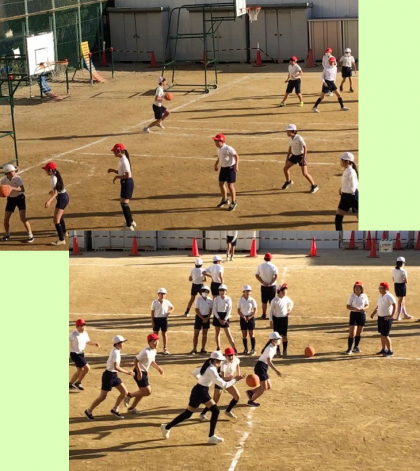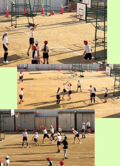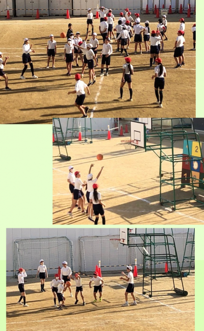 先生の合図で、試合が始まったようです。5時間目は6年1組の体育の時間。バスケットボールです。