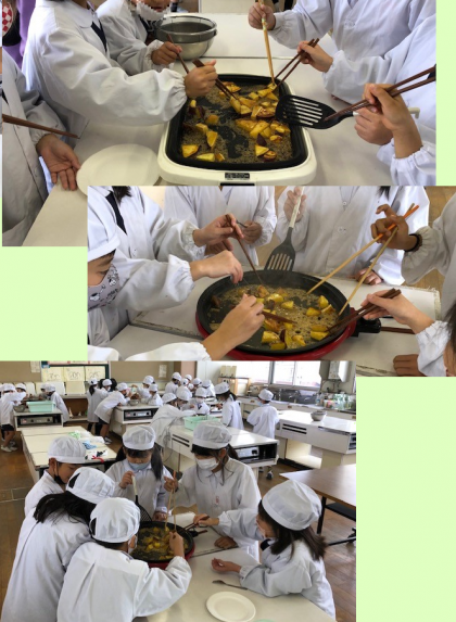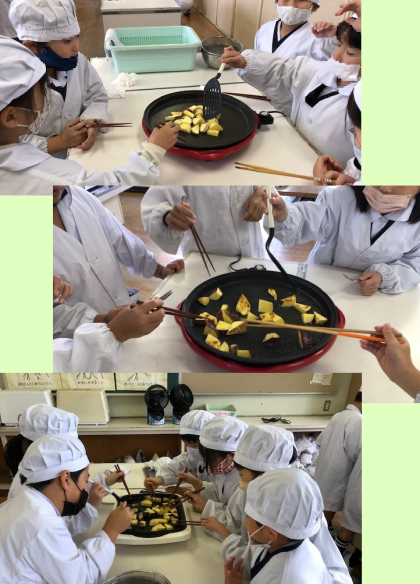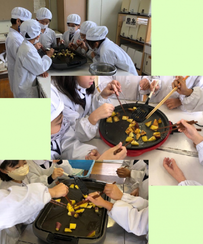 家庭科室で、先日掘り上げたおイモを、大学イモに変身させる実習です。