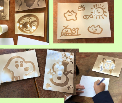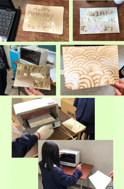 こちらでは、砂糖水で紙に絵を描き、それを焼いて、絵を浮き上がらせる「あぶりだし」をしていました。子どもたちの思い思い描く絵は、なかなかかわいいものが見られます。今日は担任の先生の誕生日とのことで、お祝いメッセージを作っている人もいました。