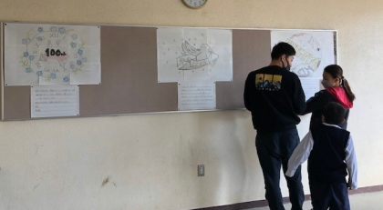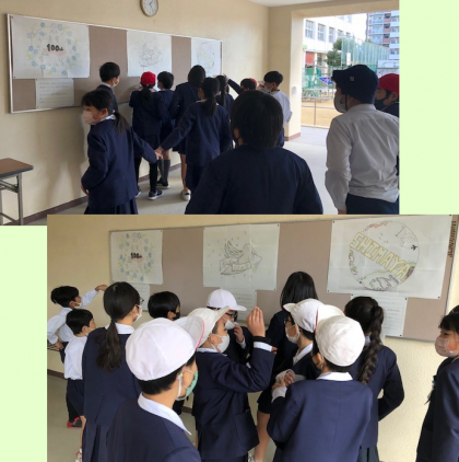 島屋小学校100周年を記念してロゴを作ろうということになり、先日、4年生以上の児童が取り組んだ中から3つの候補に絞られ、投票前の公示が行われました。