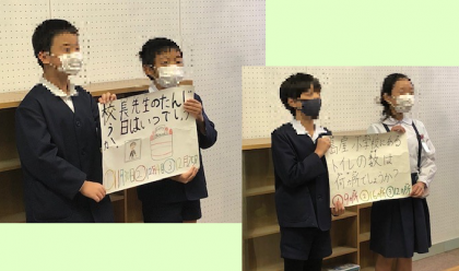 児童会からは、島屋小学校の名称や建物、児童数の推移などの解説と、島屋小学校にまつわるクイズの出題で、より学校のことを知ることができる発表がありました。