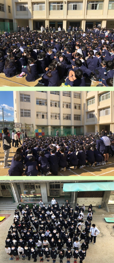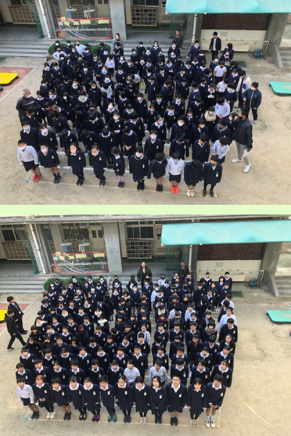 各クラスが1列に並んで前から順に枠の中に並んでいきました。後ろに教職員が並んで、パチリです。
