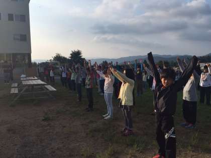 今朝は、清々しい朝で、みんな元気に過ごしています。朝の集いでは、気持ちのよい日差しを浴びて、体操をしました。