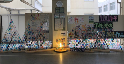 本校玄関では、みんなで制作したコップのピラミッドが輝いています。