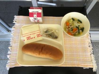 今日の献立は、鯵のレモンマリネ、てぼまめのスープ煮、スライスチーズ、黒糖パン、牛乳です。