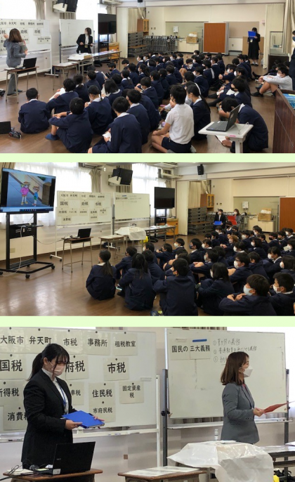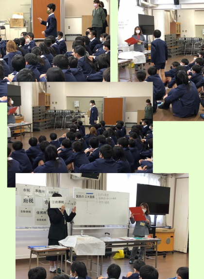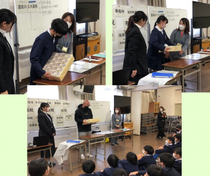 6年生2・3組が2時間目に、1・4組が3時間目に、弁天町の市税事務所の方に来ていただき、税金について学習しました。