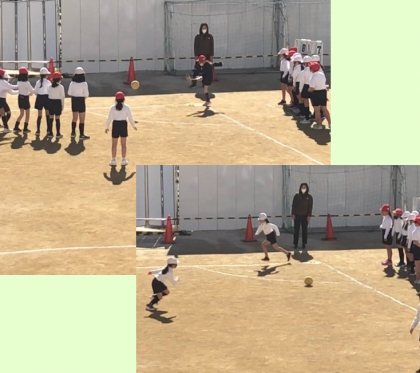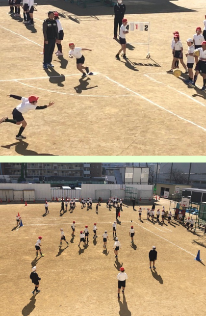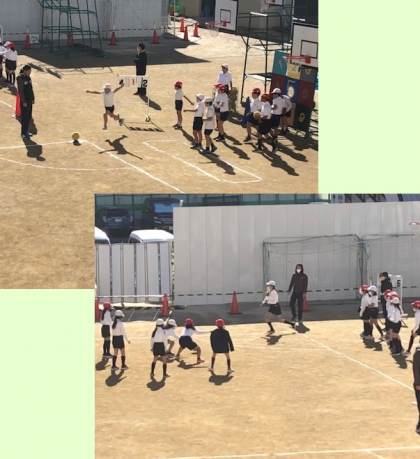 狭い運動場では2コート分しか取れず、1チームの人数が多すぎてなかなか順が回ってこないことが課題ですが、先生のアイデアで守り方に工夫を凝らし、じっと動かずに済んでしまう人がないようにしたそうです。