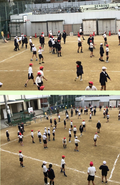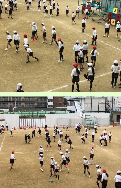 運動場全面を4つに区切って、各マスに1クラス全員が入り、「転がしドッジ」をしたとのこと。ボールは12個も投入されていたようです。