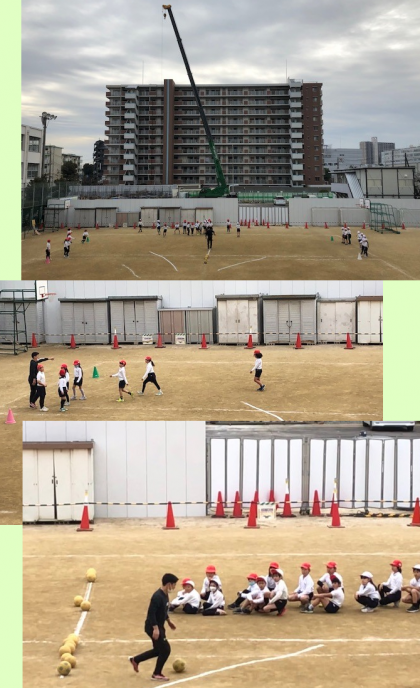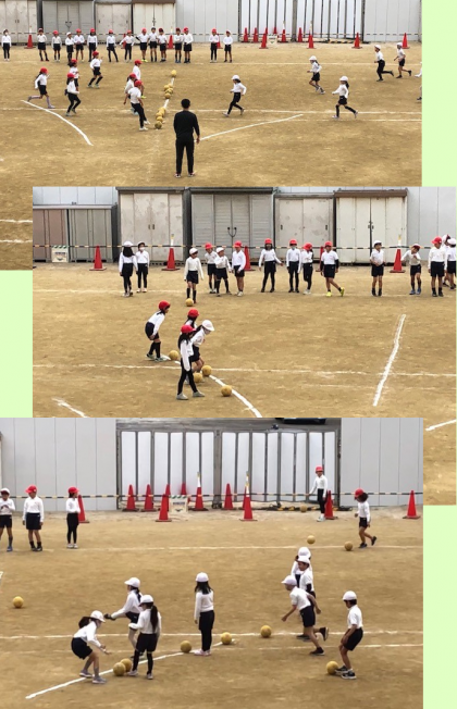 ボールを足で、扱いにくそうにしている子どもたちでしたが、やっているうちに面白いことに気付いたように見えます。