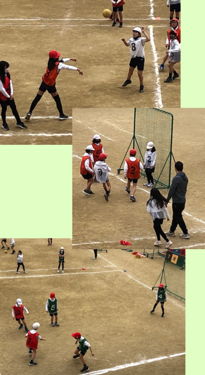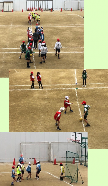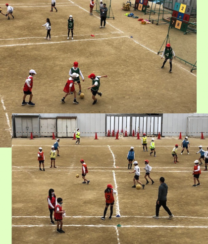 ゴールに見立てたネット前にはキーパーもいて、運動場いっぱいに3つのコートで活動です。