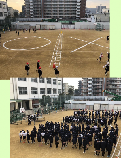 運動場に朝早くから描かれた○×の記号。今朝は1・3・5年生の児童集会です。