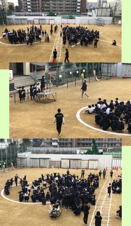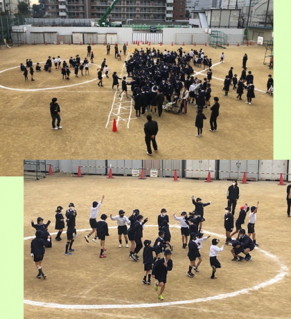 集まった子どもたちは、集会委員会の子どもたちが出すクイズの答えが、○か×か、思う方に移動します。10秒以内に心を決めないと、〇と×の記号の間にテープが張られ、移動できなくなるルールです。
