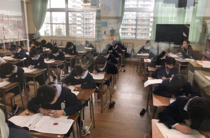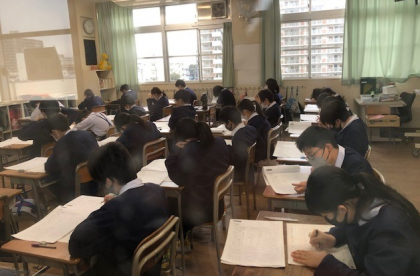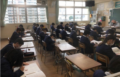 シンとした教室で、子どもたちは、各クラスでそれそれ違えど、テストのときに座る方向を向いています。