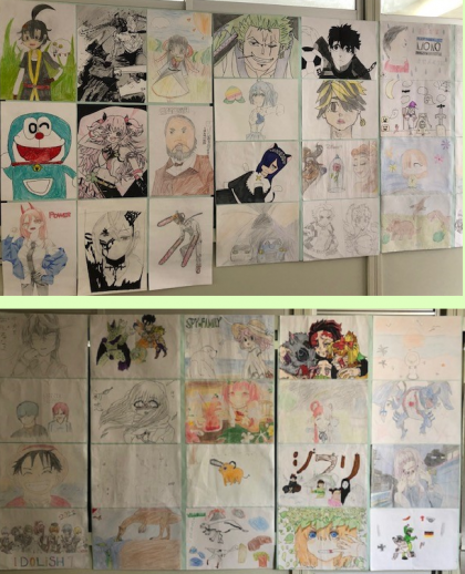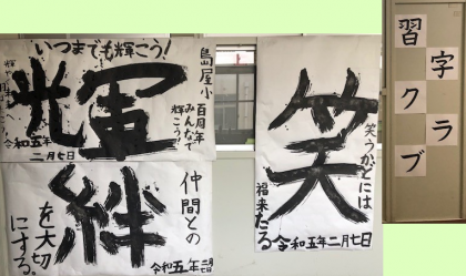 現在、職員室の前に、クラブ活動で制作した作品の展示があります。