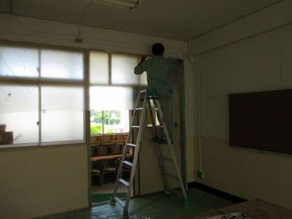 作業内容は、1年4組・5組それに、学習室の壁面の塗装です。学習室の隣の生活科室は、本校の管理作業員さん2名でこれまでに同じ作業を済ませてください、それに続けての合同作業です。長年の汚れで黒くなっていた壁が白くなり、教室全体が明るくなった気がします。