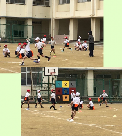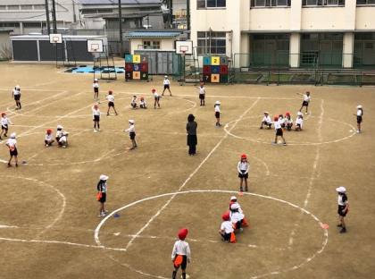 3時間目の運動場。子どもたちが腰にカラーのフラッグをつけて活動しているのは1年1組です。
