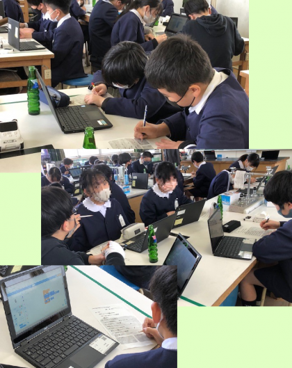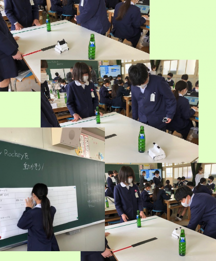 少しでも小回りをすることが有利になるのでしょうか。子どもたちは班で話し合いながら微調整を繰り返します。パソコンを抱え、何度も修正です。