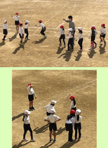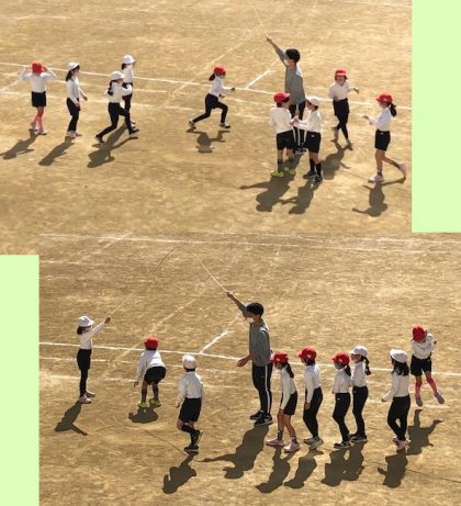 縄の回し手の片方には担任の先生がいて、大きく大きく回しています。