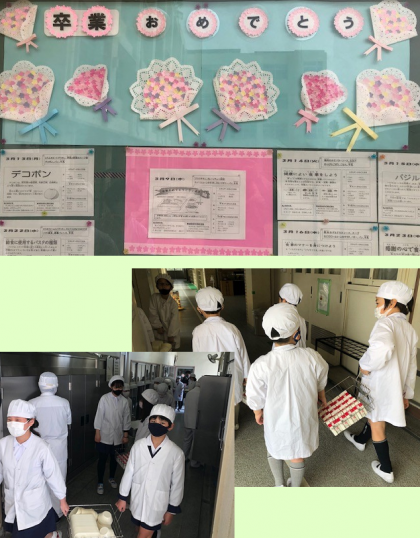 給食室にやって来る子どもたちが、いつもよりテンションが高めに見えるのは気のせいでしょうか。給食室前も卒業を祝う掲示物が貼られ、みんなで6年生のお祝いです。
