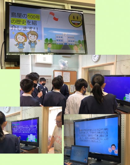 今日の朝の時間。9チャンネルを使って、6年生が、これまで調べた島屋小学校のことを発表をしました。100周年記念の今年の取り組みの集大成です。