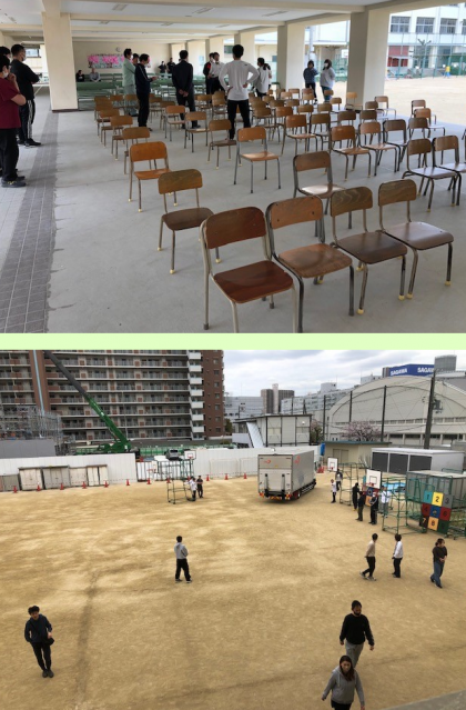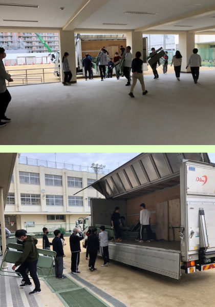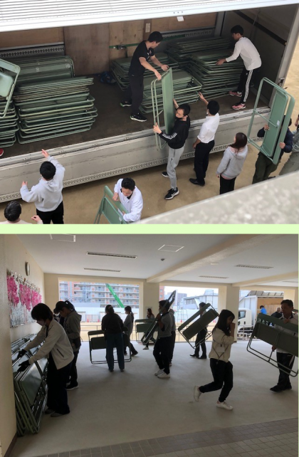 大きなトラックが、工事で狭められた運動場側の入口から入って来るのを迎え入れ、職員みんなで長椅子を運びます。